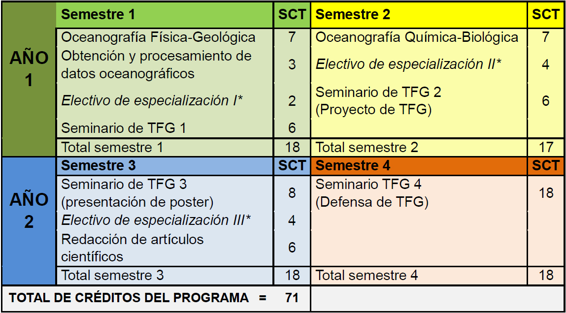El Trabajo Final de Graduación (TFG) del Magíster en Oceanografía es un trabajo individual inédito realizado por el alumno bajo la supervisión de un académico guía. Este trabajo podrá ser en la forma de tesis de grado o de una actividad formativa equivalente. El TFG deberá exhibir una sólida fundamentación teórica y constituir un aporte para la disciplina o para las líneas de especialización del Programa.